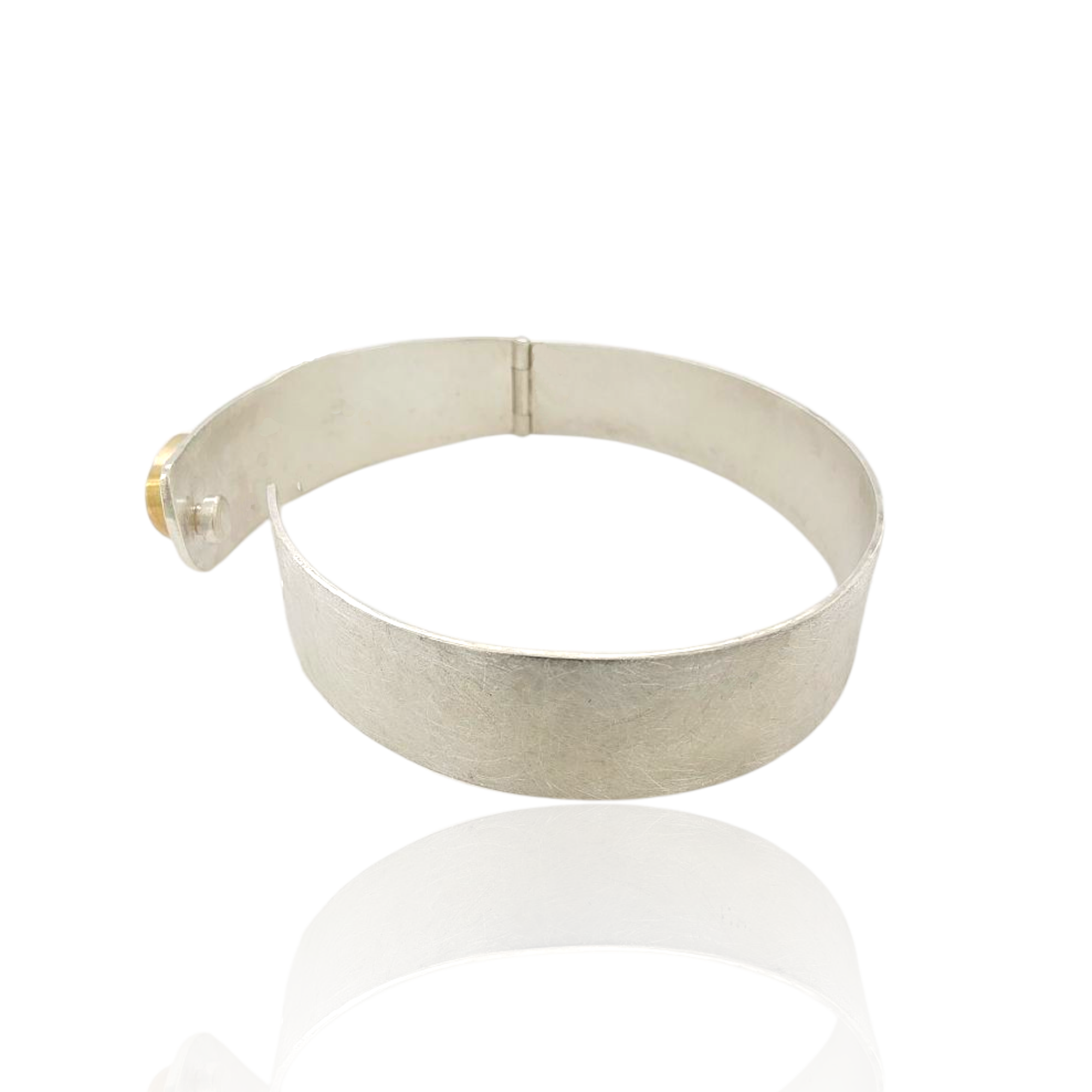 Die Oberfläche des Armreifs ist mit einem feinem Hammerschlag versehen, der das Licht auf besondere Weise reflektiert und dem Stück eine organische, lebendige Textur verleiht. Ein aufgelöteter Streifen aus reinstem Feingold setzt einen edlen Kontrast und unterstreicht die Hochwertigkeit dieses besonderen Designs. Trotz seiner massiven Anmutung lässt sich der Reif mühelos mit seinem Knopfverschluss unterhalb des Opals mit nur einer Hand öffnen und schließen – eine durchdachte, elegante Lösung, die Komfort und Stil vereint.