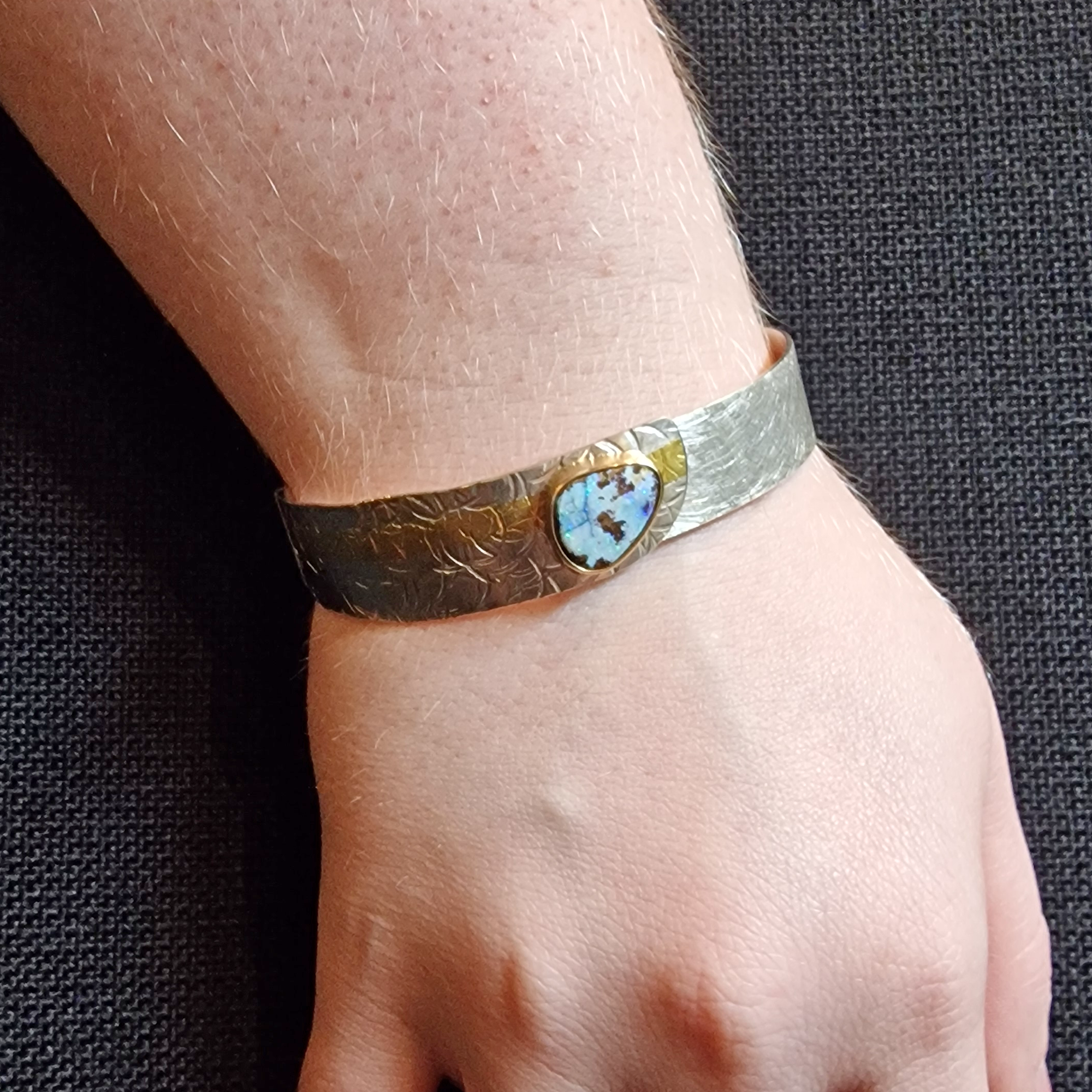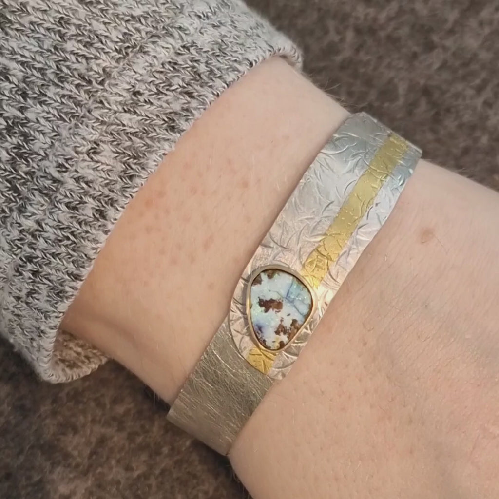 Handgeschmiedeter Armreif mit Struktur und Knopfverschluss mit Boulder Opal in Silber und Feingold