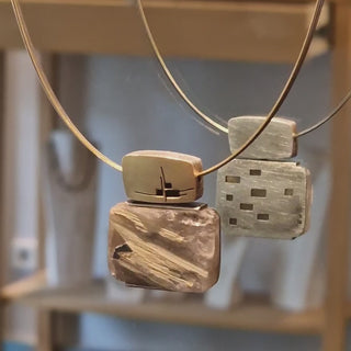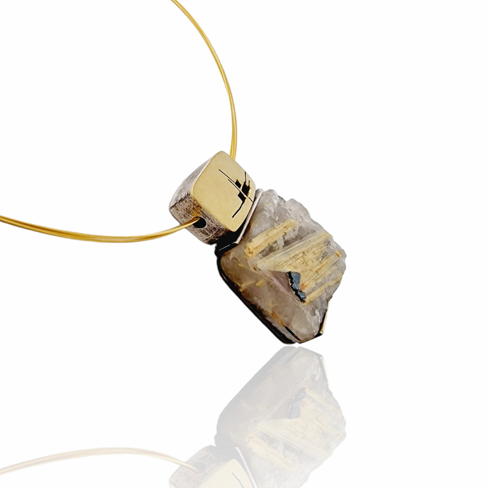 Der Ketten Anhänger ist mit einem naturbelassenen Rutilquarz in einer luftigen 925/- Sterlingsilber Fassung gearbeitet. Der Kasten, durch den die Aufhängung für den Halsreif läuft, ist aus 925/- Sterling Silber, dessen Vorderseite mit einer 0,5 mm starken Schicht 750/- Gelbgold belegt und durch ein besonderes Sägemuster verziert ist. Durch den naturbelassenen Rutilquarz und das Sägemuster ist der Anhänger ein wahres Unikat.