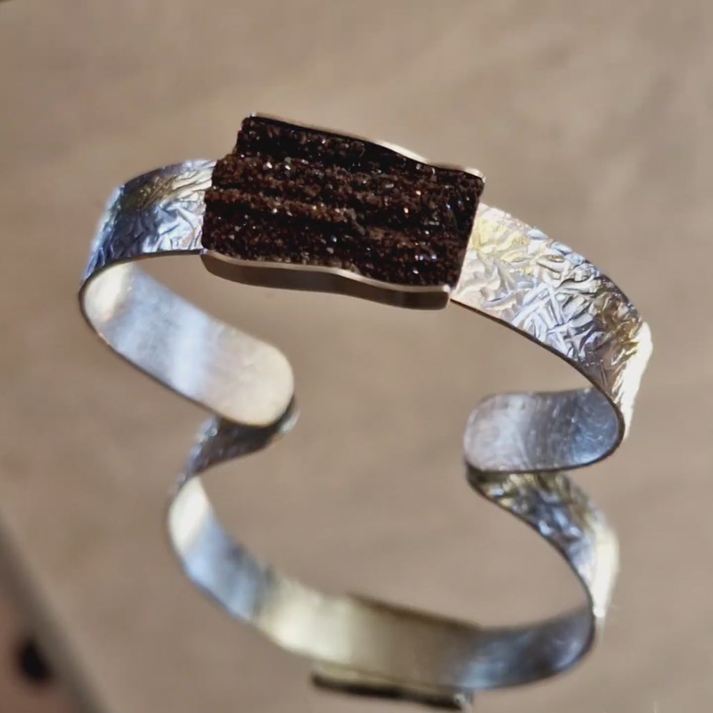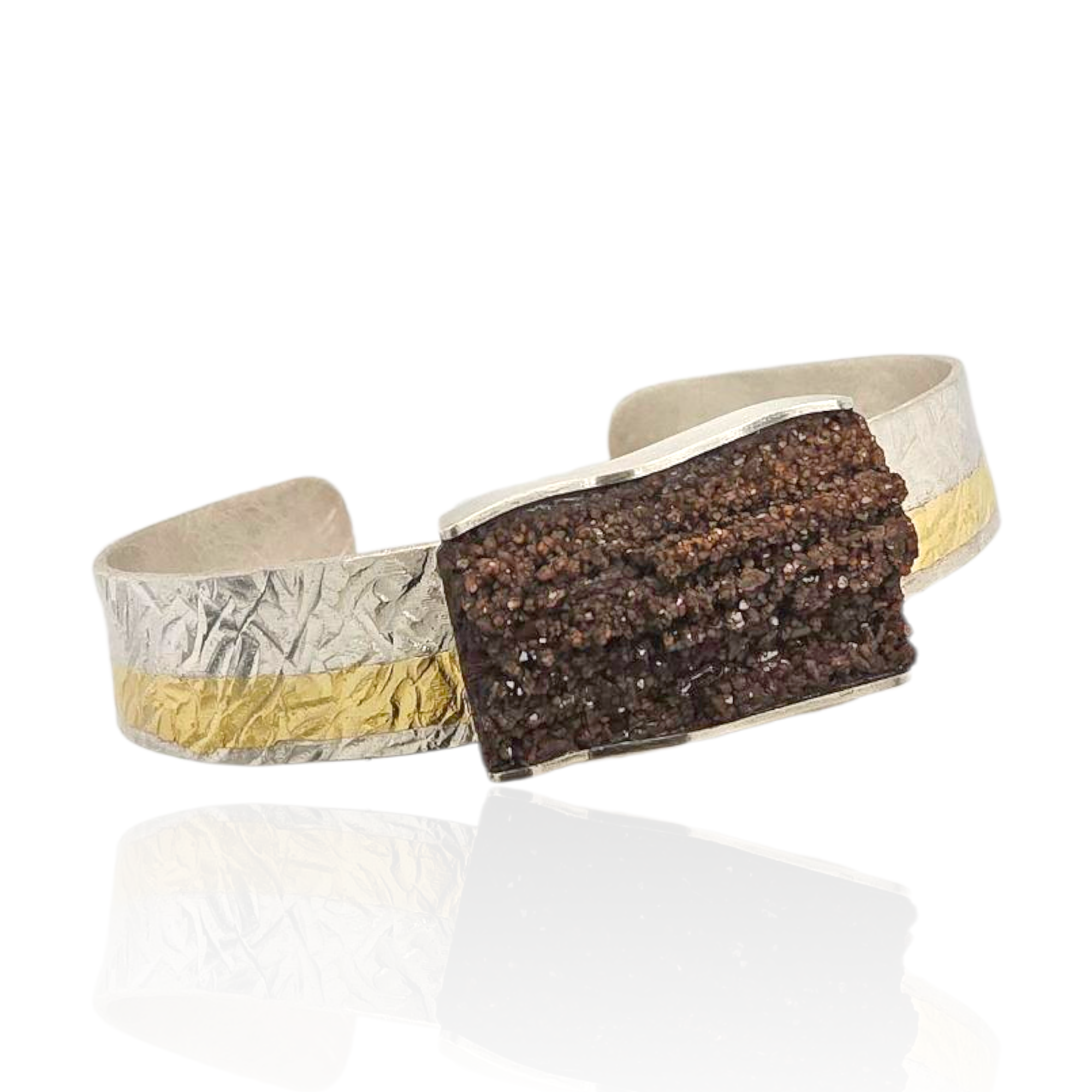 Handgefertigt von uns, präsentiert jedes Stück eine organische Holzstruktur in Erdtönen mit glitzernden Kristallen, eingefasst in strukturiertem Silber mit Feingoldstreifen – ein perfektes Zusammenspiel von Natur und Handwerkskunst.