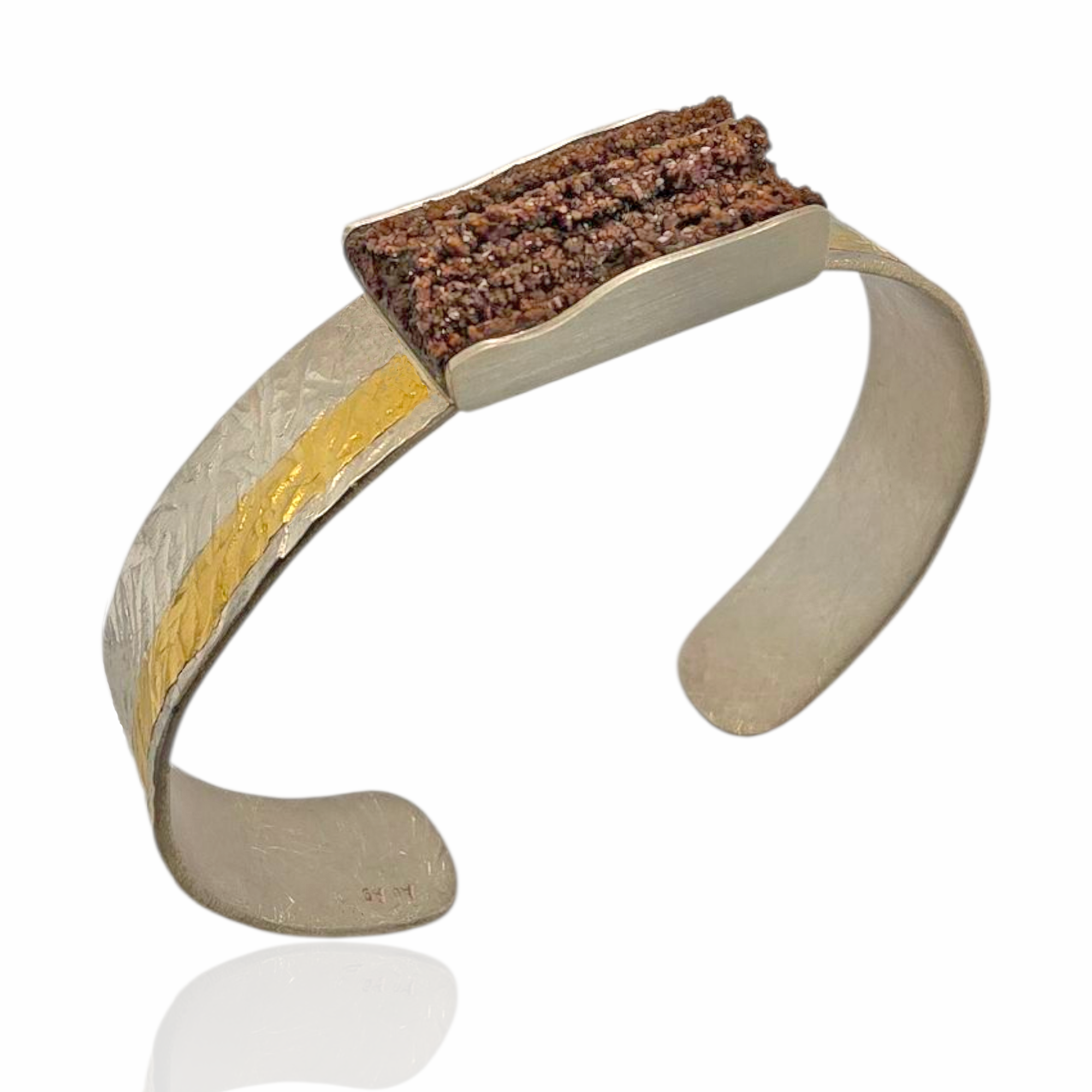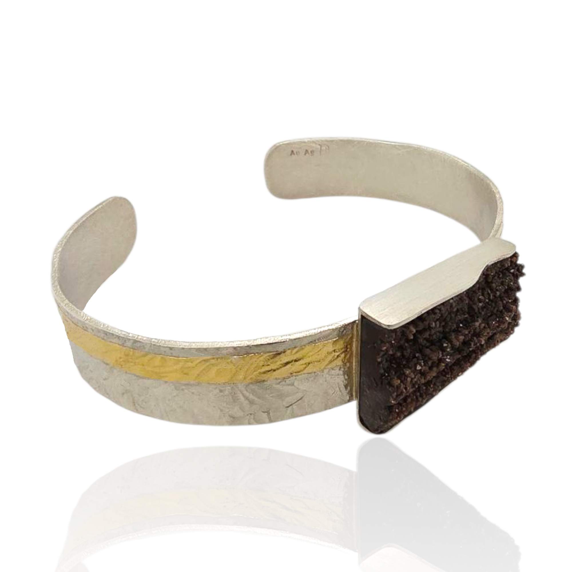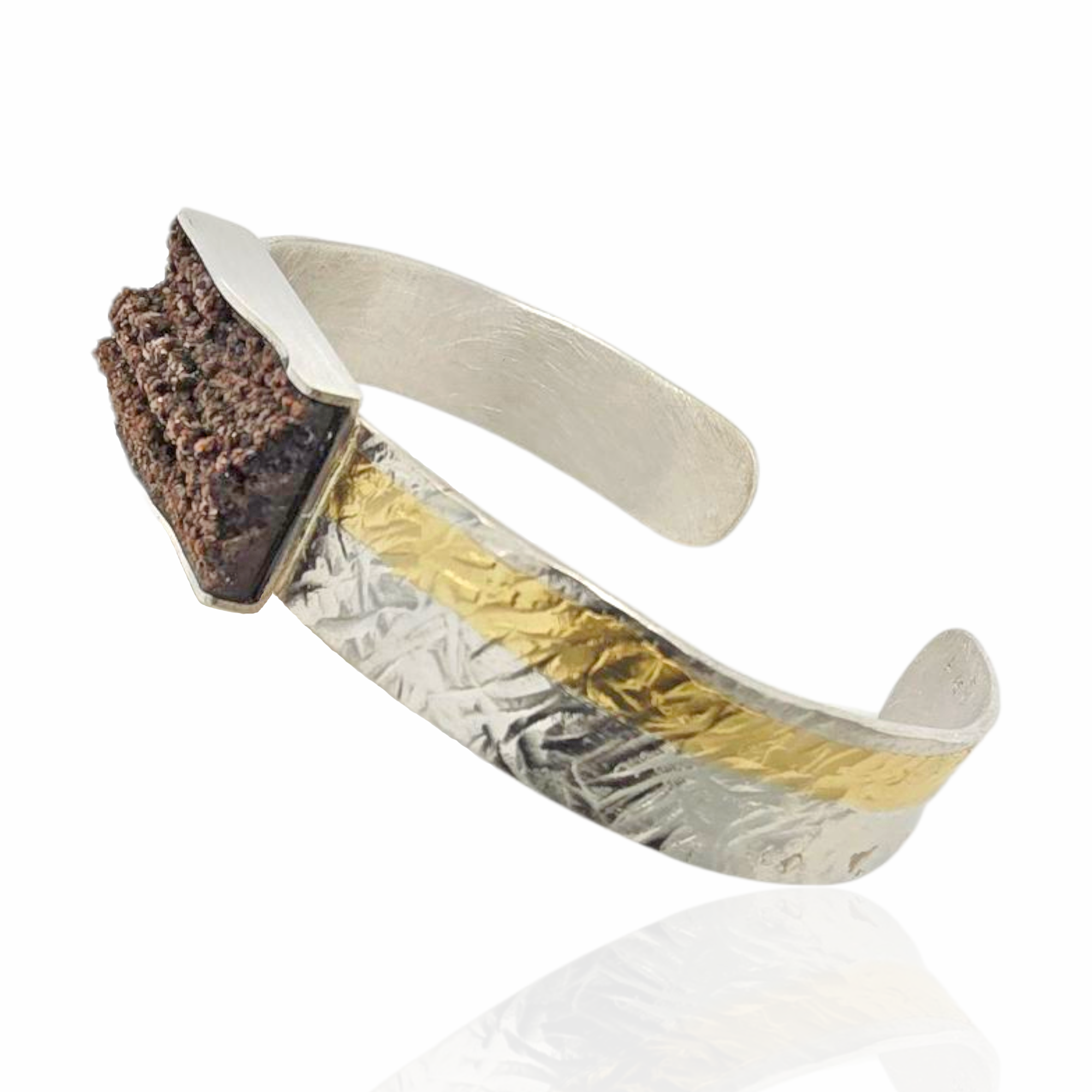 Dieser einzigartige Armschmuck vereint die raue Schönheit natürlichen versteinerten Holzes mit der edlen Ausstrahlung von 925/- Sterling Silber und Feingoldakzenten.