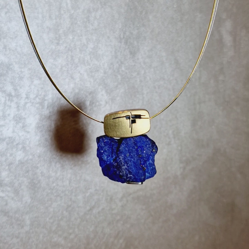 Besonderer Kettenanhänger mit naturbelassenem Lapislazuli, Unikatschmuck aus Gelbgold und Silber