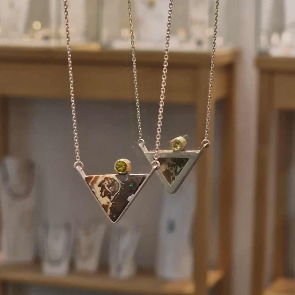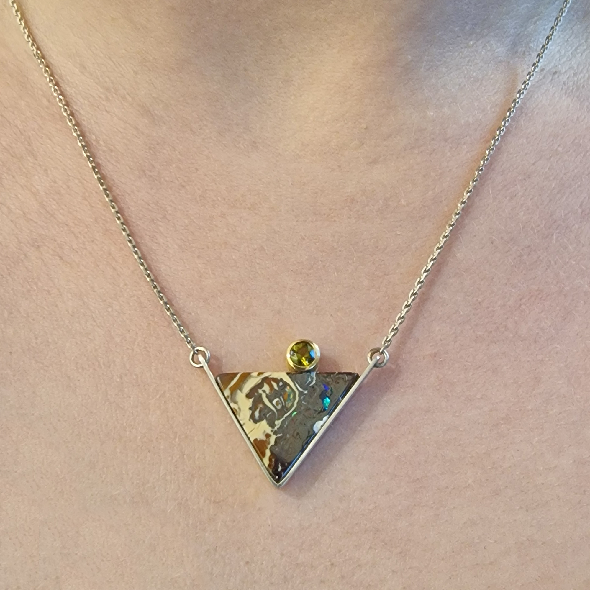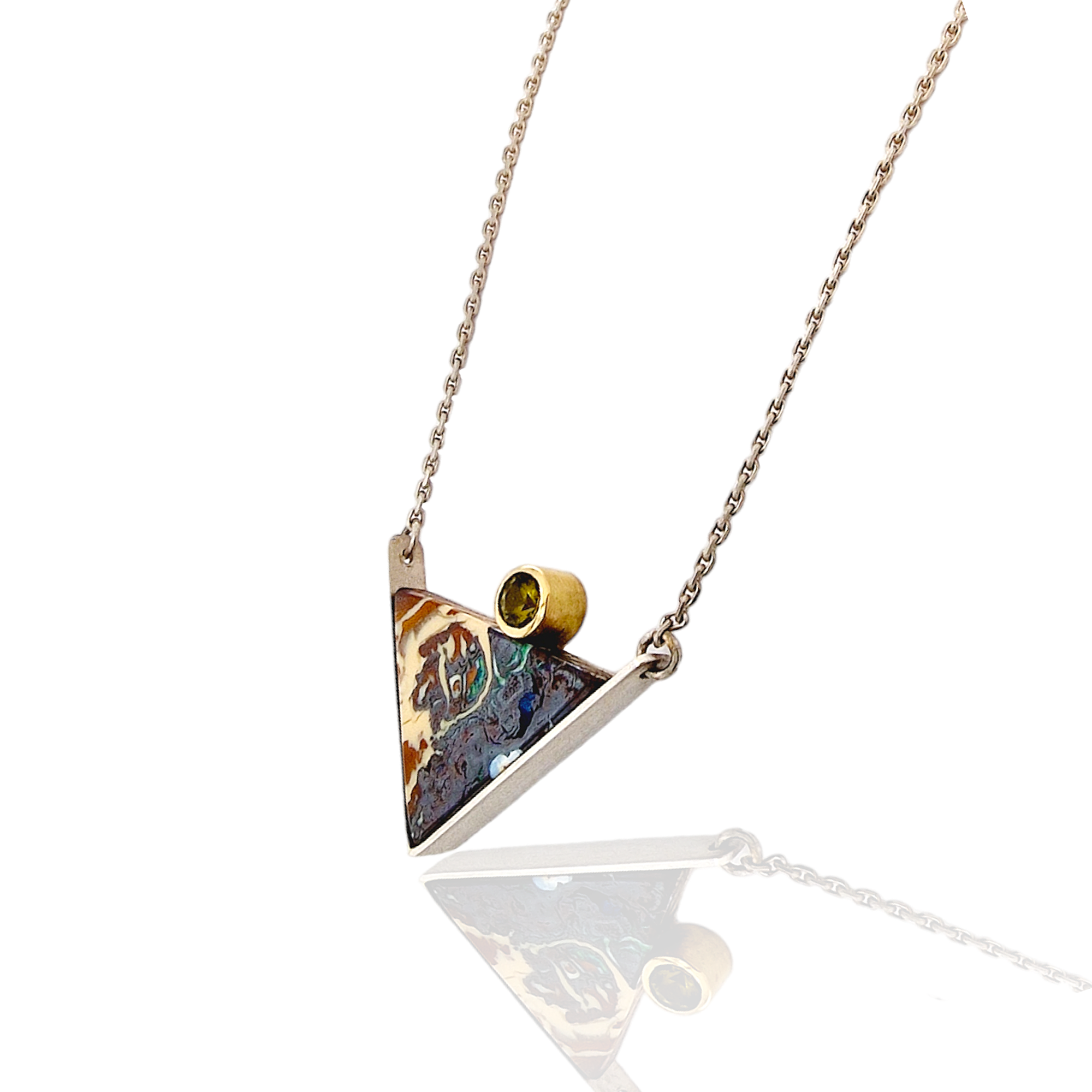 Entdecke die faszinierende Schönheit dieser individuellen Halskette, gefertigt aus 925/- Silber und 750/- Gelbgold. Der kleine dreieckige Anhänger besticht durch einen Boulder Opal, der je nach Lichteinfall in atemberaubenden türkisblauen bis kräftig grünen Tönen schimmert. Die grünen Sprenkel des Opals werden durch einen 4 mm großen facettierten Peridot aufgegriffen, der in einer Außenzarge aus 750er Gelbgold eingefasst ist.