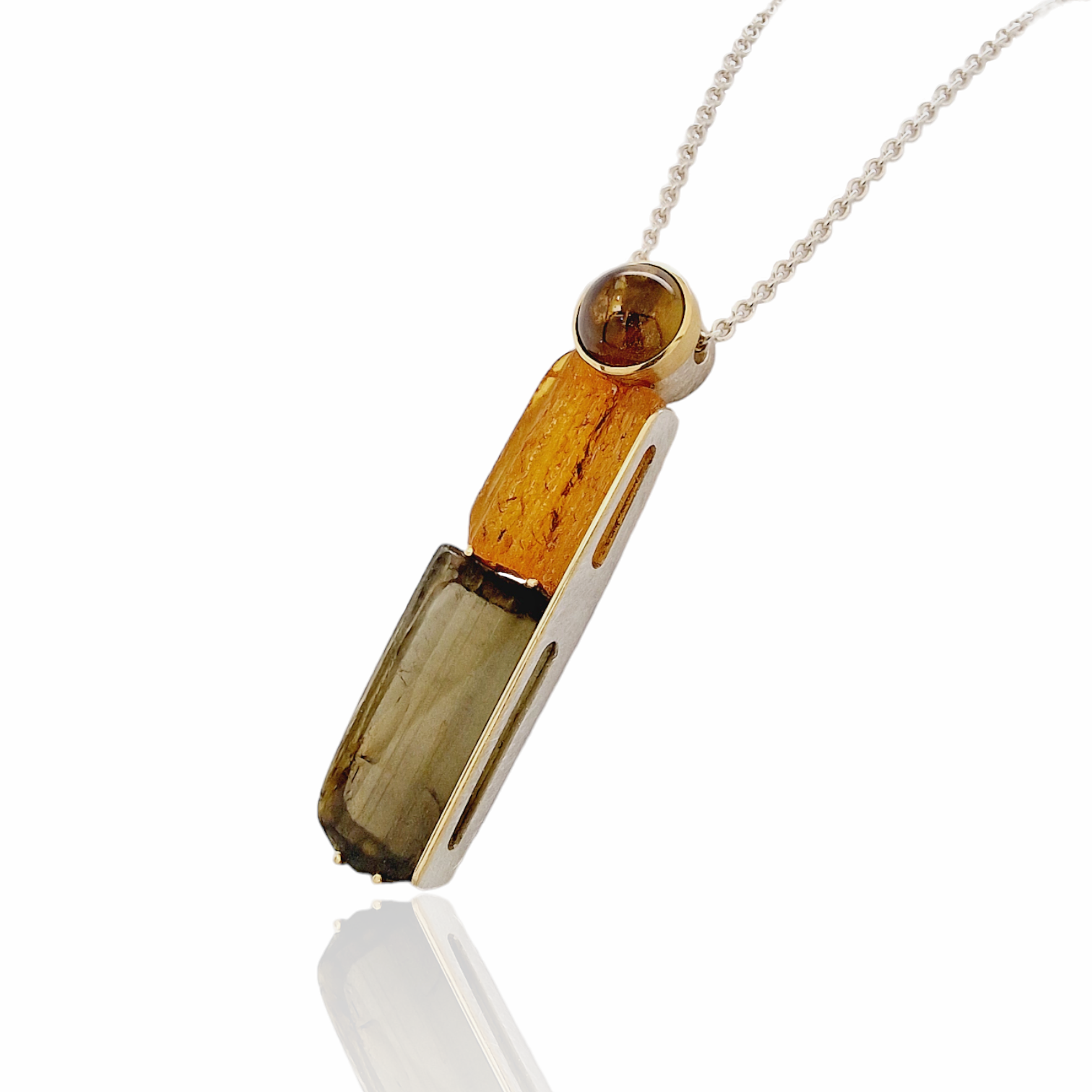 Entdecke die exquisite Schönheit dieses langen Anhängers, kunstvoll gefertigt aus 750/- Gelbgold und 925/- Silber, verziert mit zwei Turmalinen und einem Bernstein. Der oberste Stein ist ein olivfarbenes Turmalin Cabochon, gefasst in Gelbgold mit einer Innenzarge aus Silber. Der mittlere Stein ist ein naturbelassener honigfarbener Bernstein, während der unterste Stein eine perfekte Mischung aus den beiden vorangegangenen Steinen darstellt.