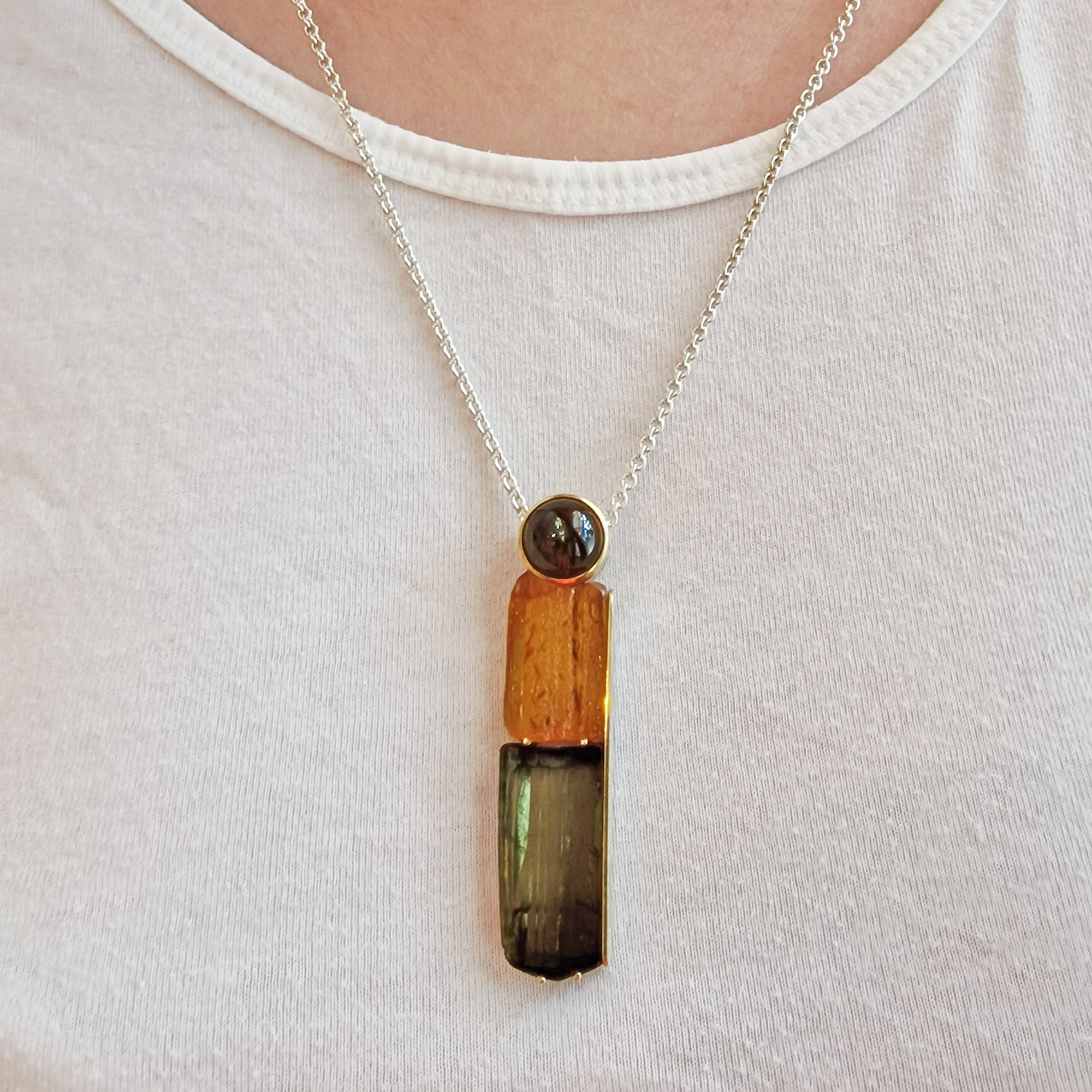 Die Rückseite des untersten Steins ist naturbelassen, während die Vorderseite poliert ist, um die Struktur der Rückseite sichtbar zu machen. Die beiden unteren Steine werden durch feine Gelbgoldkrappen und einem langen Steg auf der linken Seite gehalten, welcher mit einer 0,5 mm starken Gelbgoldschicht verlötet ist. Die Rückseite des Anhängers ist aus 925/- Silber gefertigt, was dem Schmuckstück eine besondere Eleganz verleiht.
