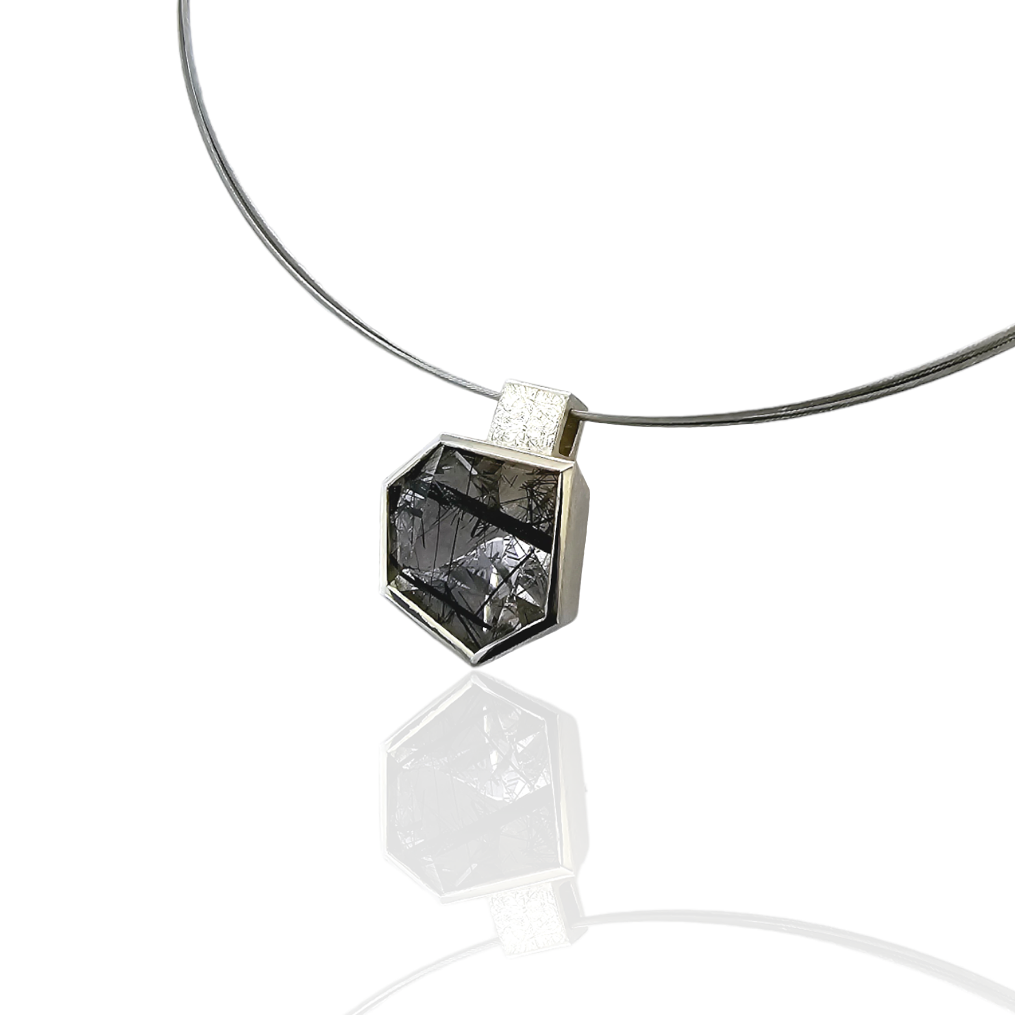 Sechseckiger Quarz Kettenanhänger aus 925/- Silber mit schwarzen Turmalinnadel Einschlüssen