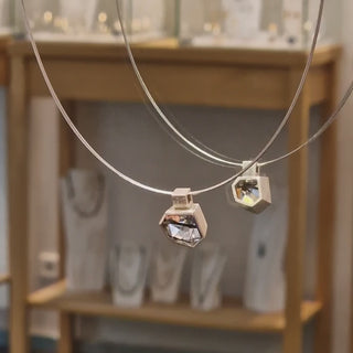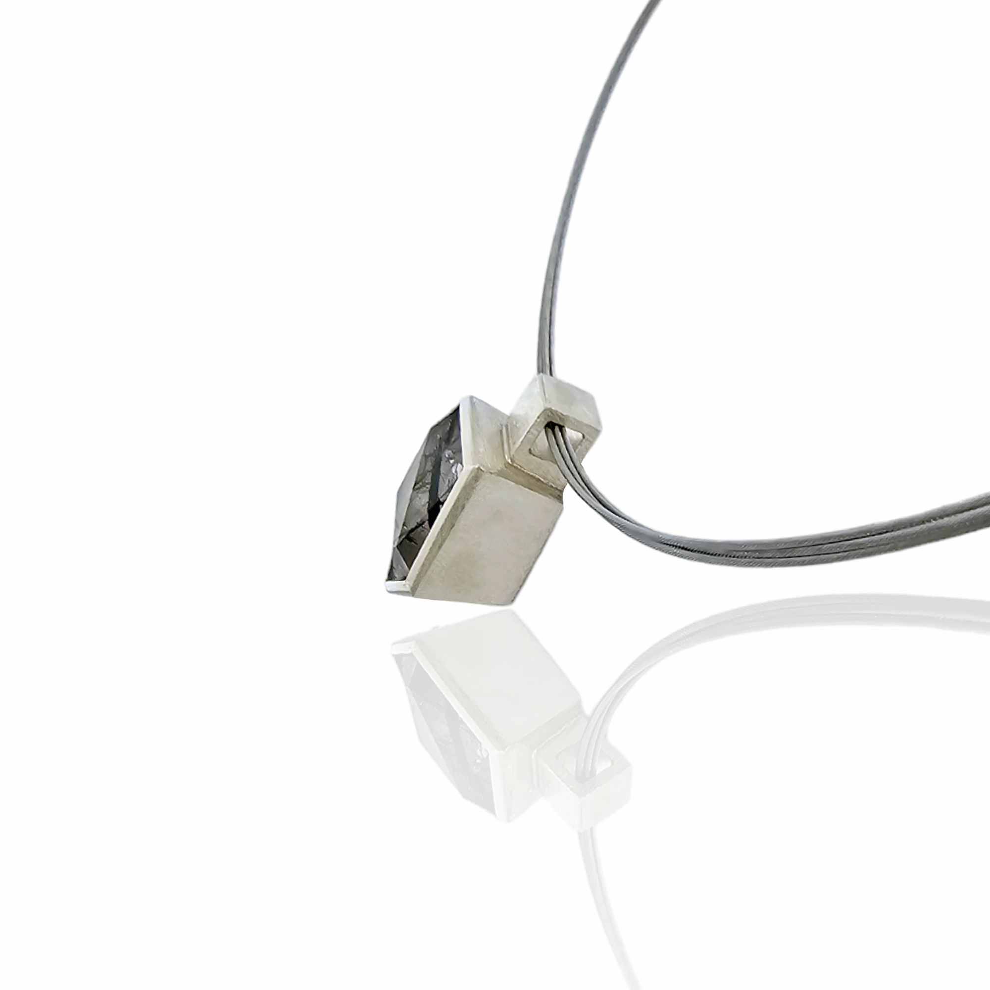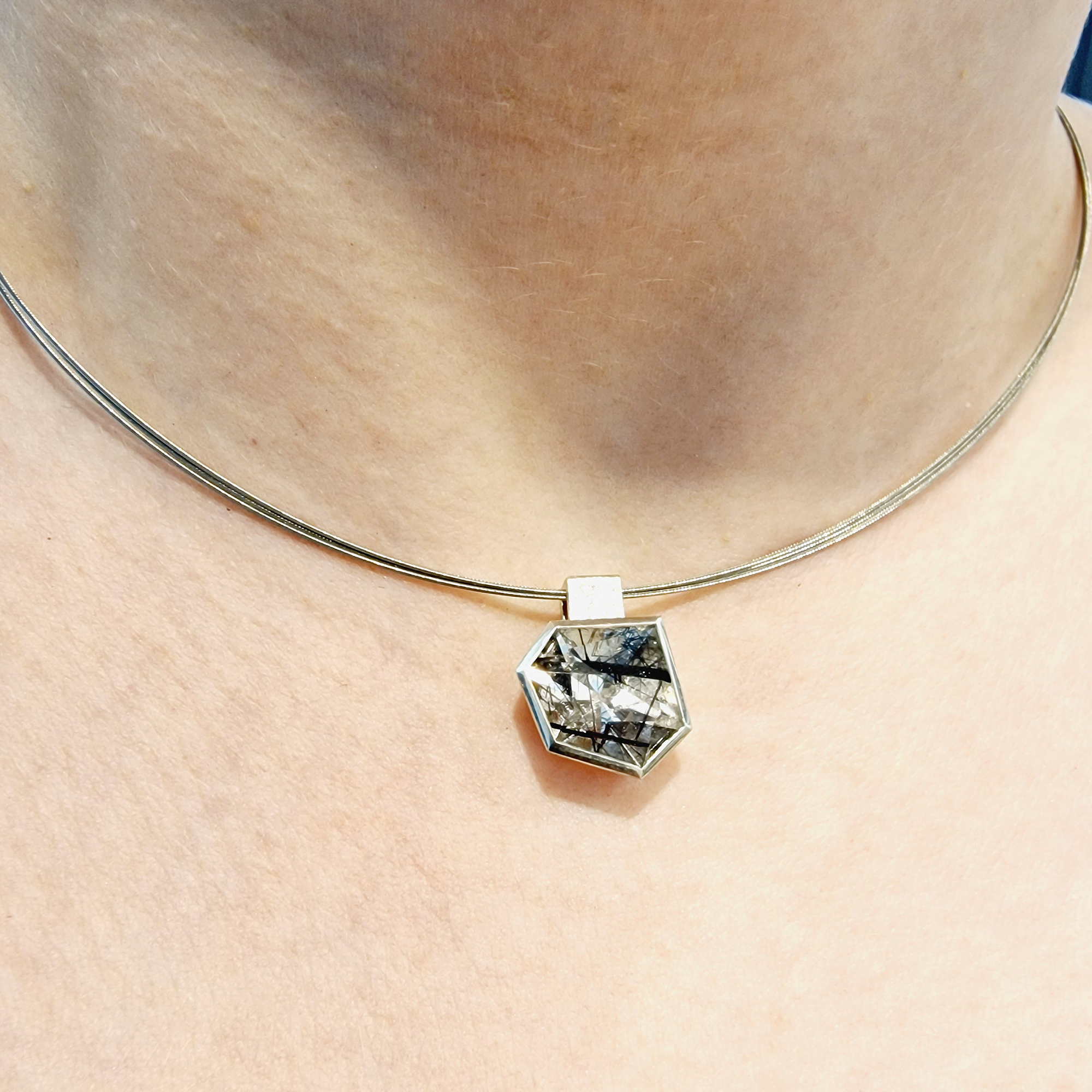 Die minimalistische Gestaltung anhand der geometrischen Form betont die Reinheit der Materialien und die natürliche Schönheit des Edelsteins. Als Aufhängung dient ein viereckiges Scharnier durch das der Halsreif geführt wird.