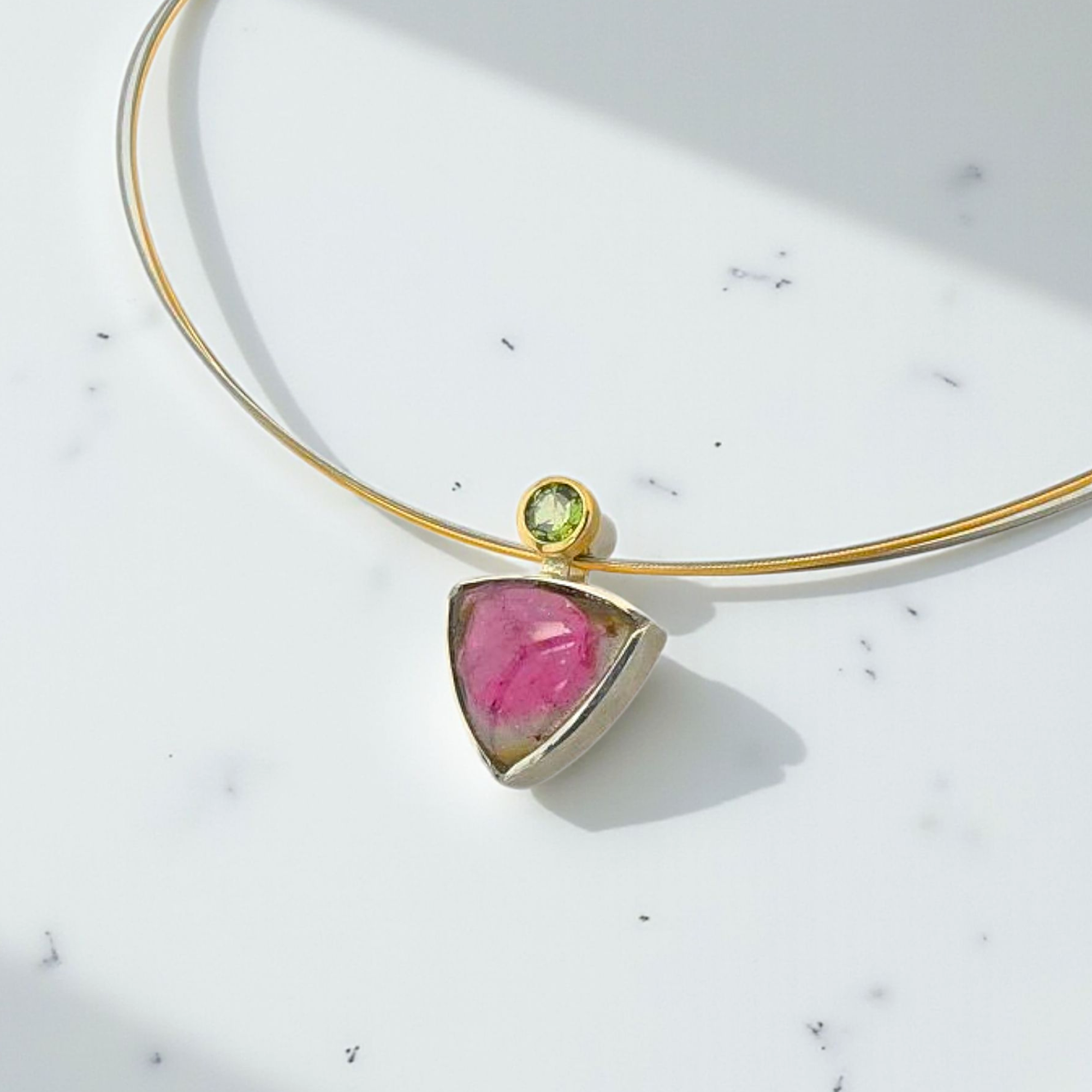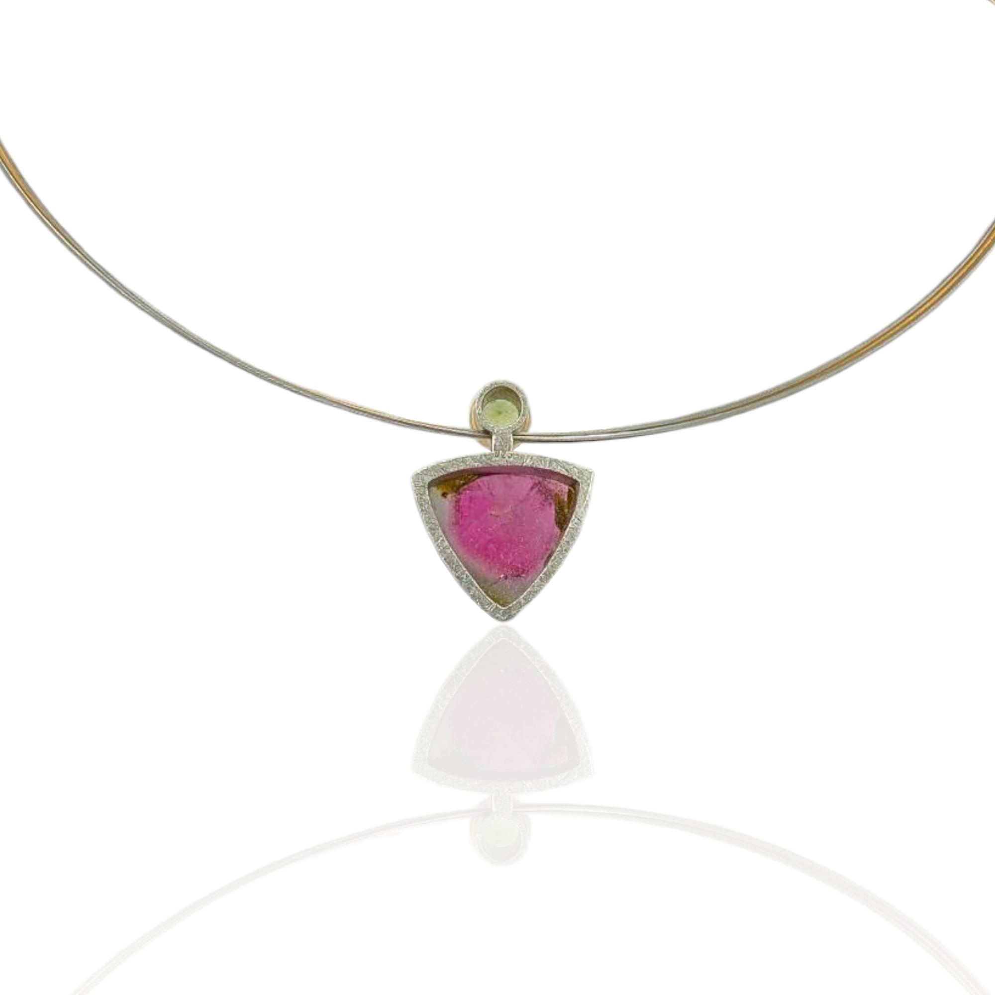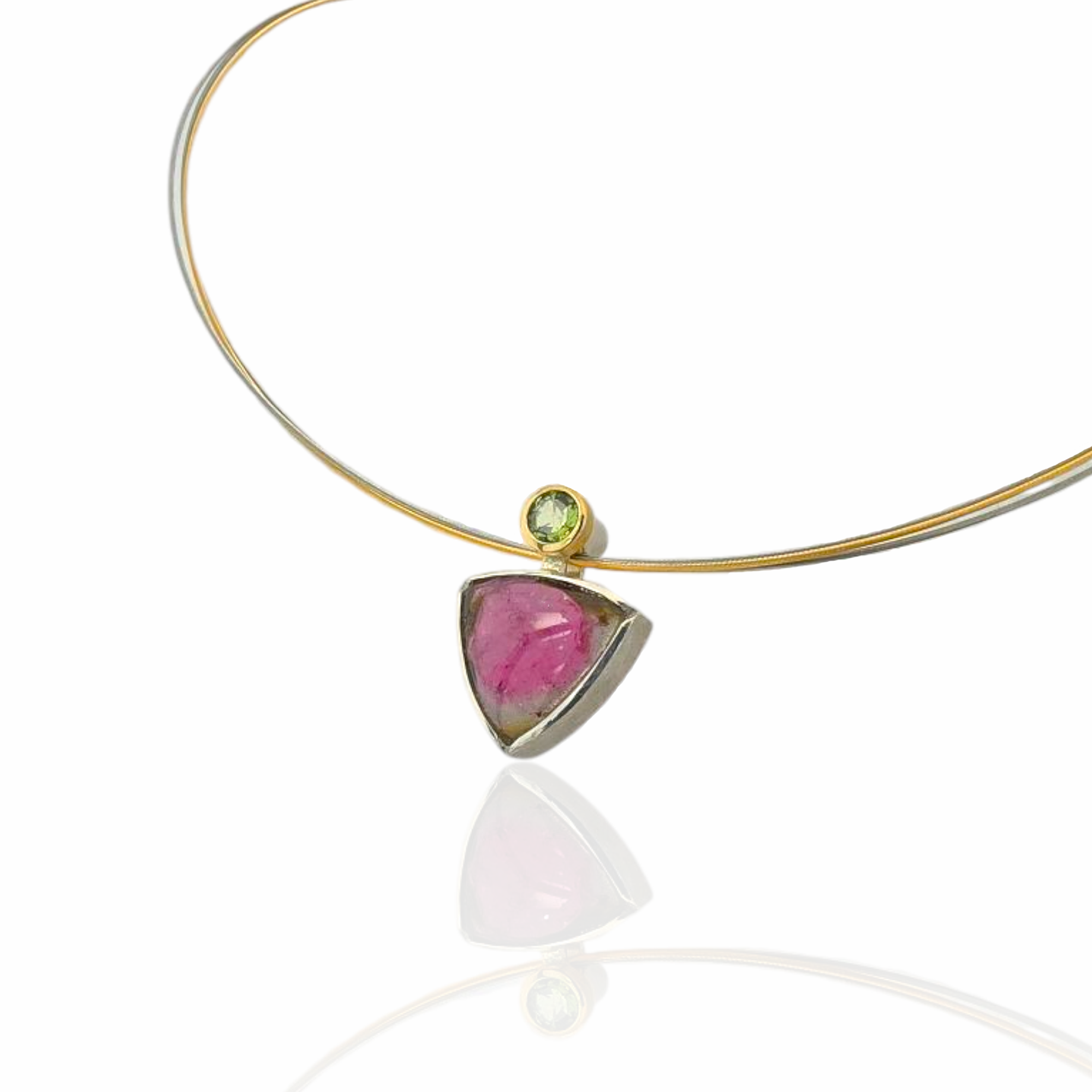 Im Zentrum: ein seltener, dreieckiger Wassermelonen Turmalin, deren Farbverlauf von zartem Rosa bis zu kräftigem Grün reicht – wie ein eingefangener Sommermoment.