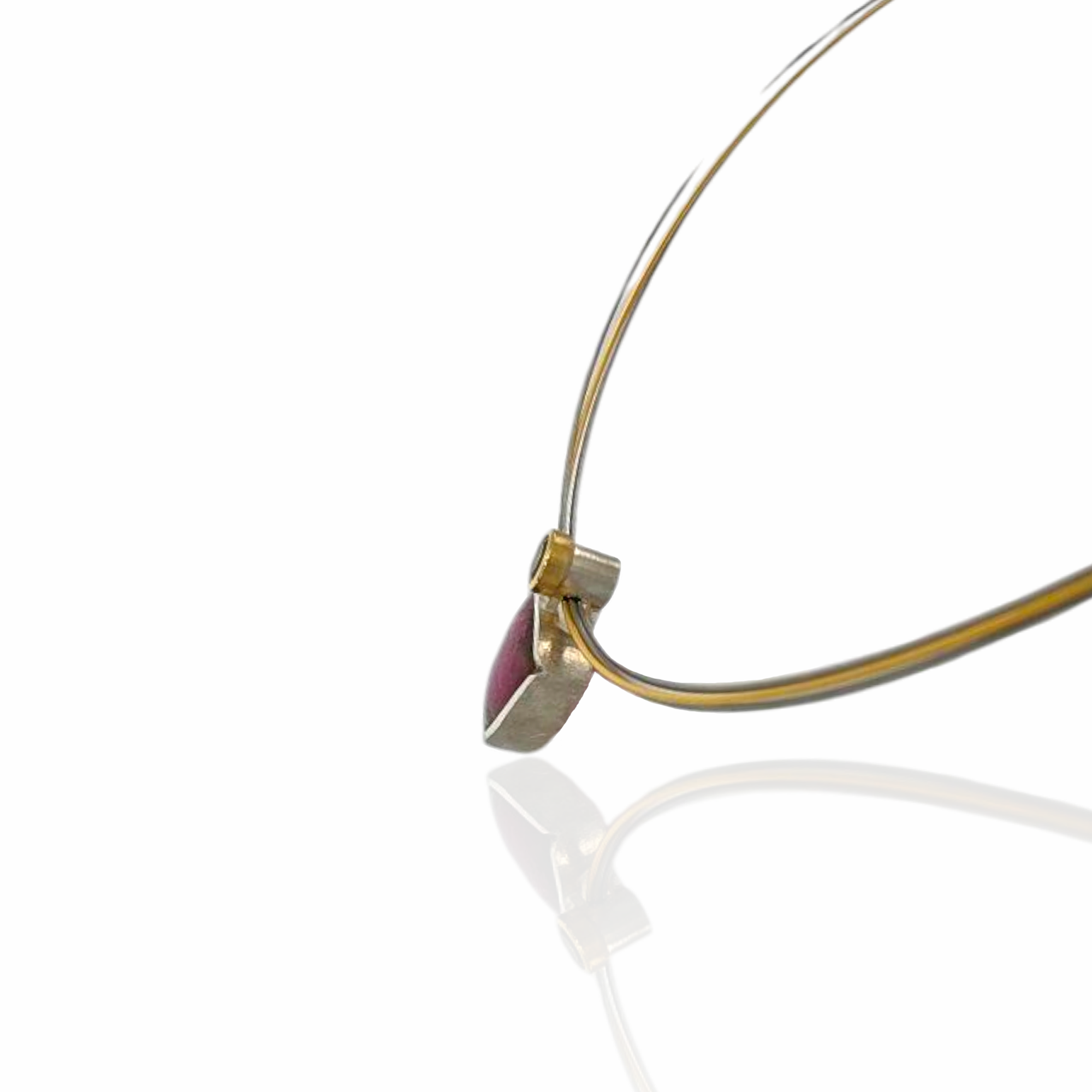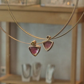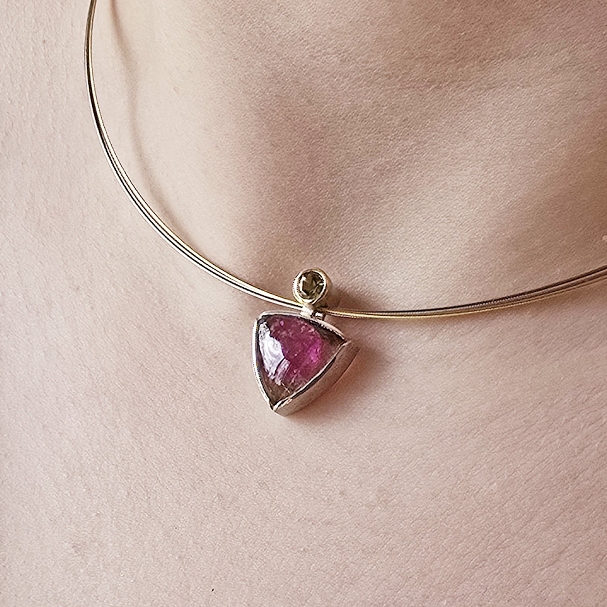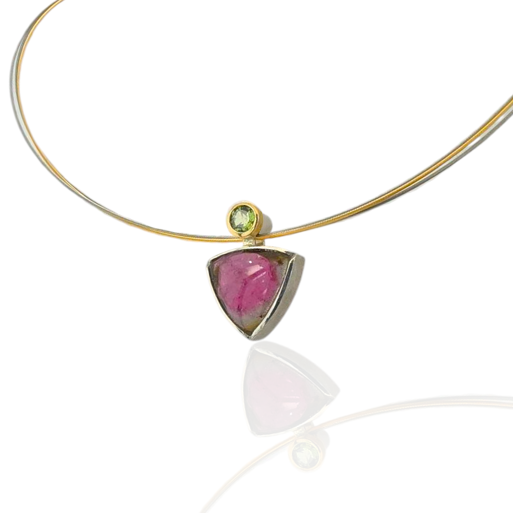 Im Zentrum: ein seltener, dreieckiger Wassermelonen Turmalin, deren Farbverlauf von zartem Rosa bis zu kräftigem Grün reicht – wie ein eingefangener Sommermoment.