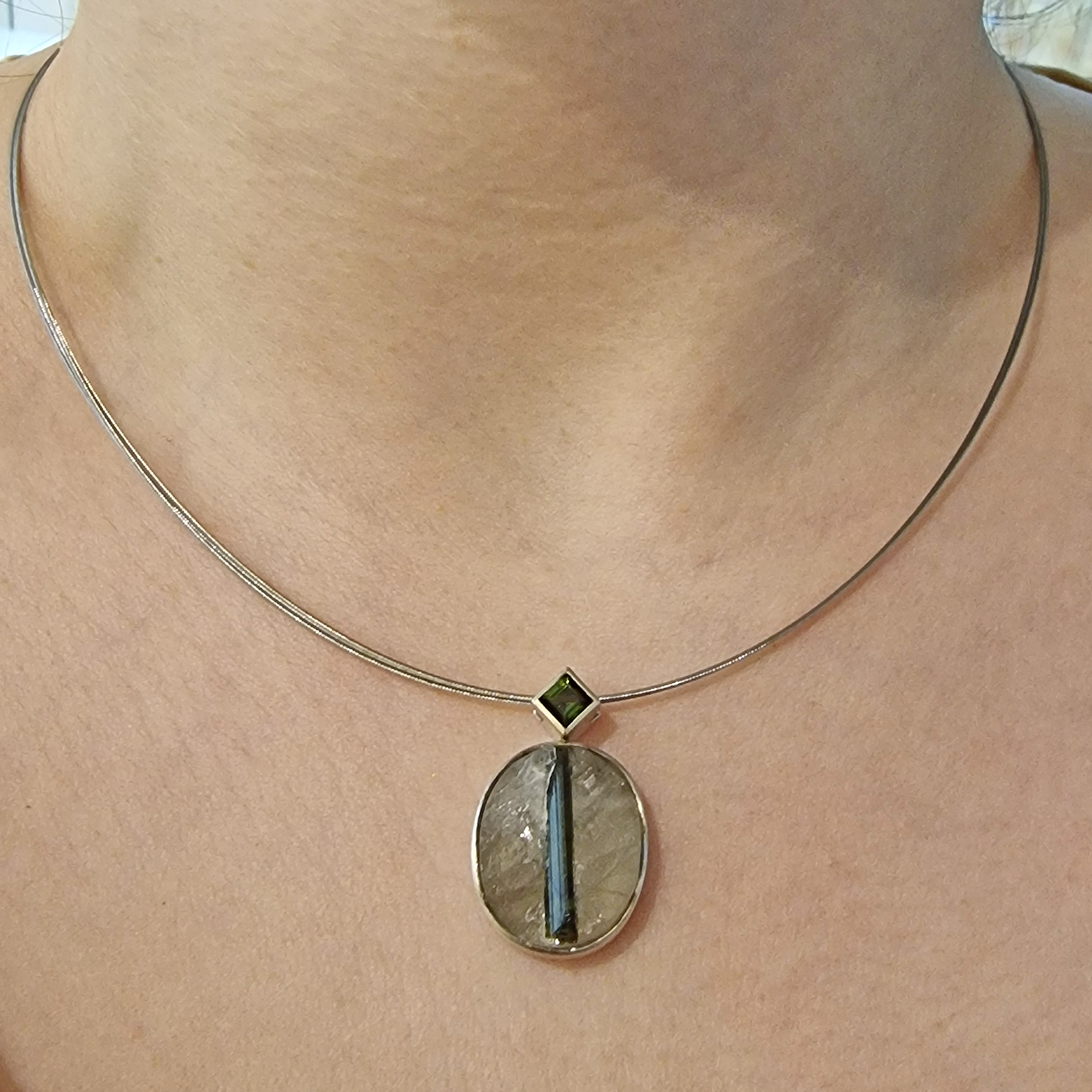 Die Aufhängung läuft durch die Fassung eines grünfarbenen Turmalins, der die Farbe der Nadel im Bergkristall wieder aufgreift.